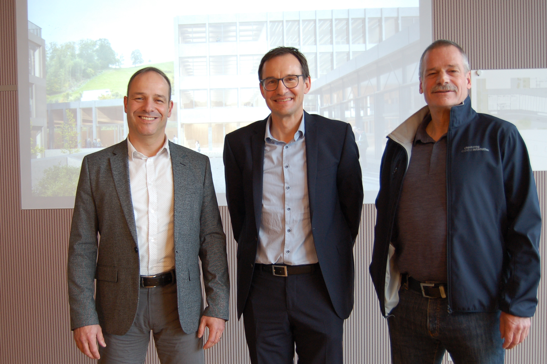 v.l. Tobias Widmer (Rektor), Daniel Schweizer (Siegerprojekt), Markus Möhl (Präsident Schulvorstand)